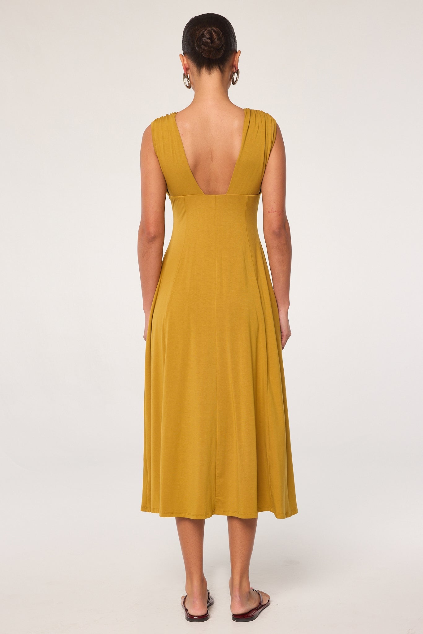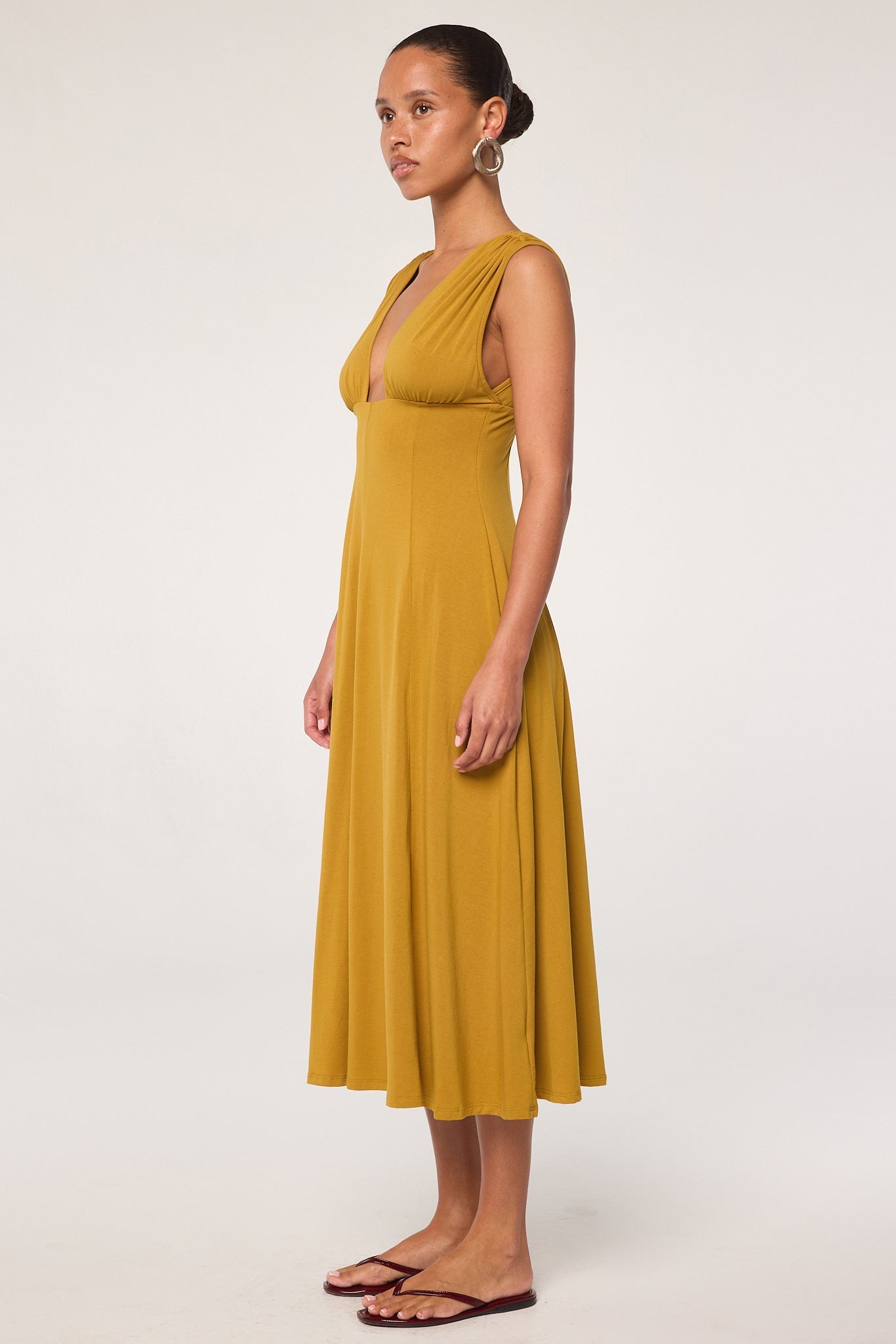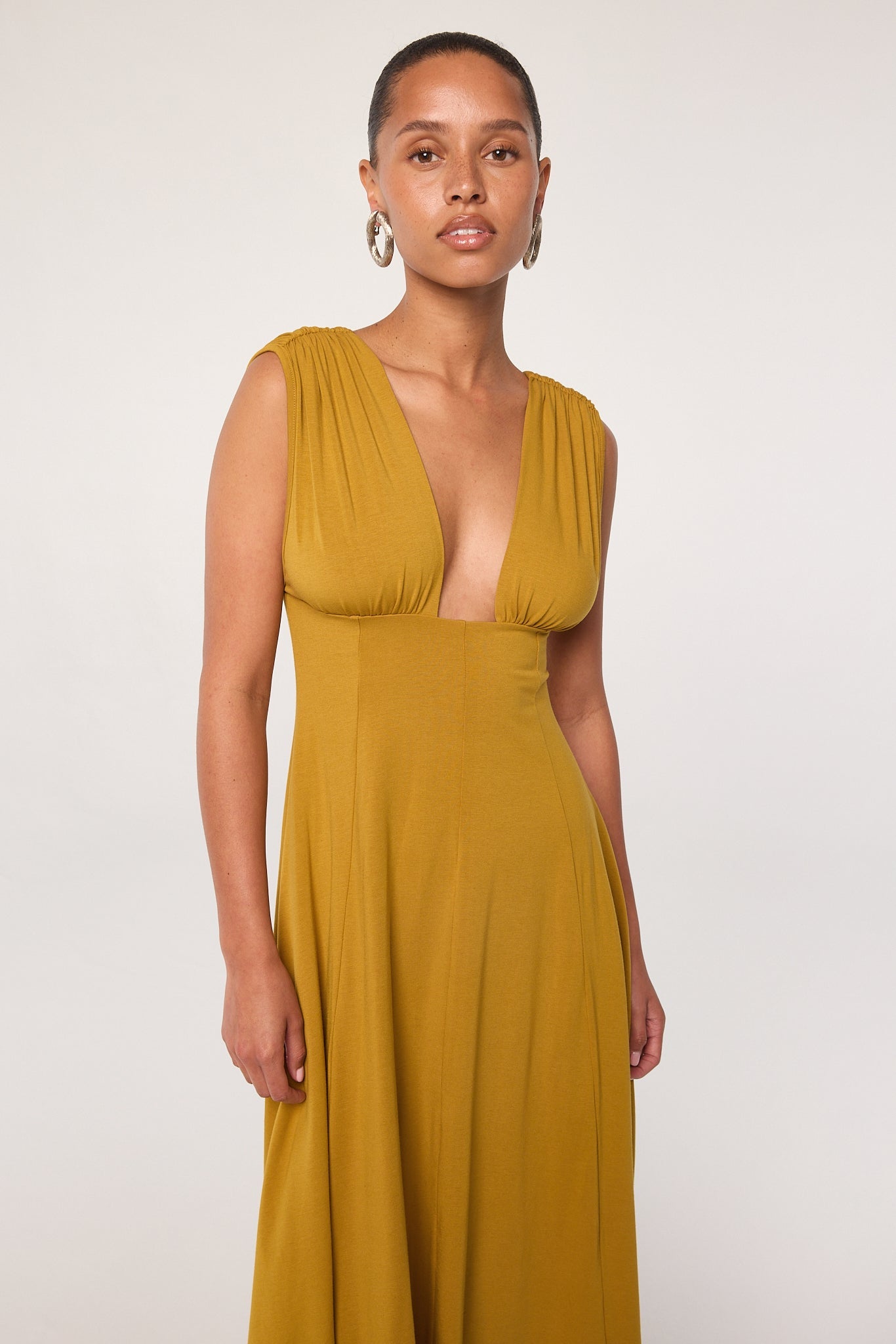 The Elva is a dress that can stand on its own or serve as a blank canvas for your statement accessories. Cut from our luxuriously soft cotton-modal jersey, it features a plunging neckline that cinches under the bust and a paneled skirt that creates a slender shape at the waist. The dress is half-lined for added comfort, lining ends at the knee. Wear yours with strappy flat sandals or chic heels.