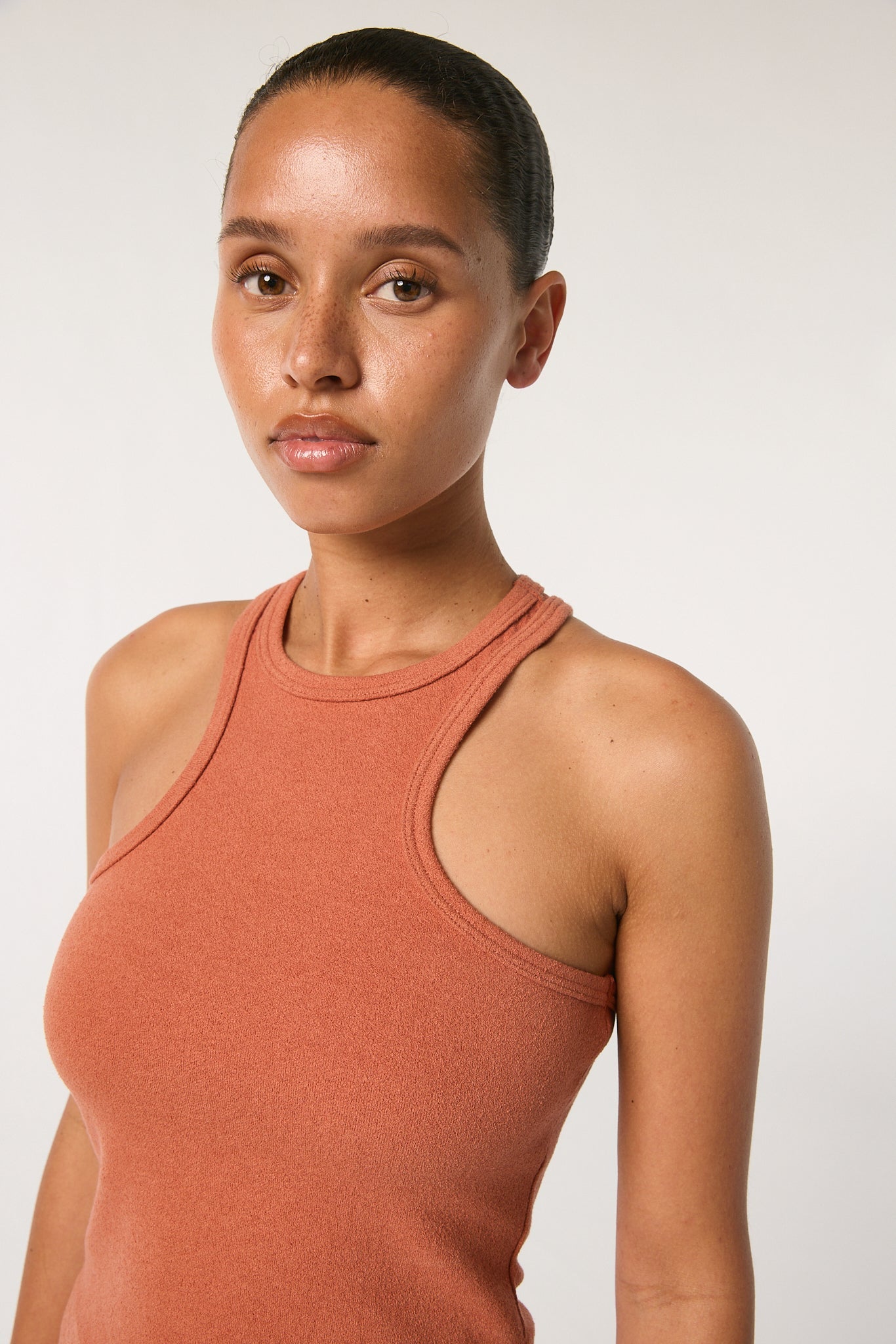 Cut from a Japanese thick terry textured fabric, the Tatum is a racerback tank and features a flattering neckline and a slightly cropped hem. Pairs well with the matching Kiko short or low-rise wide leg trousers.