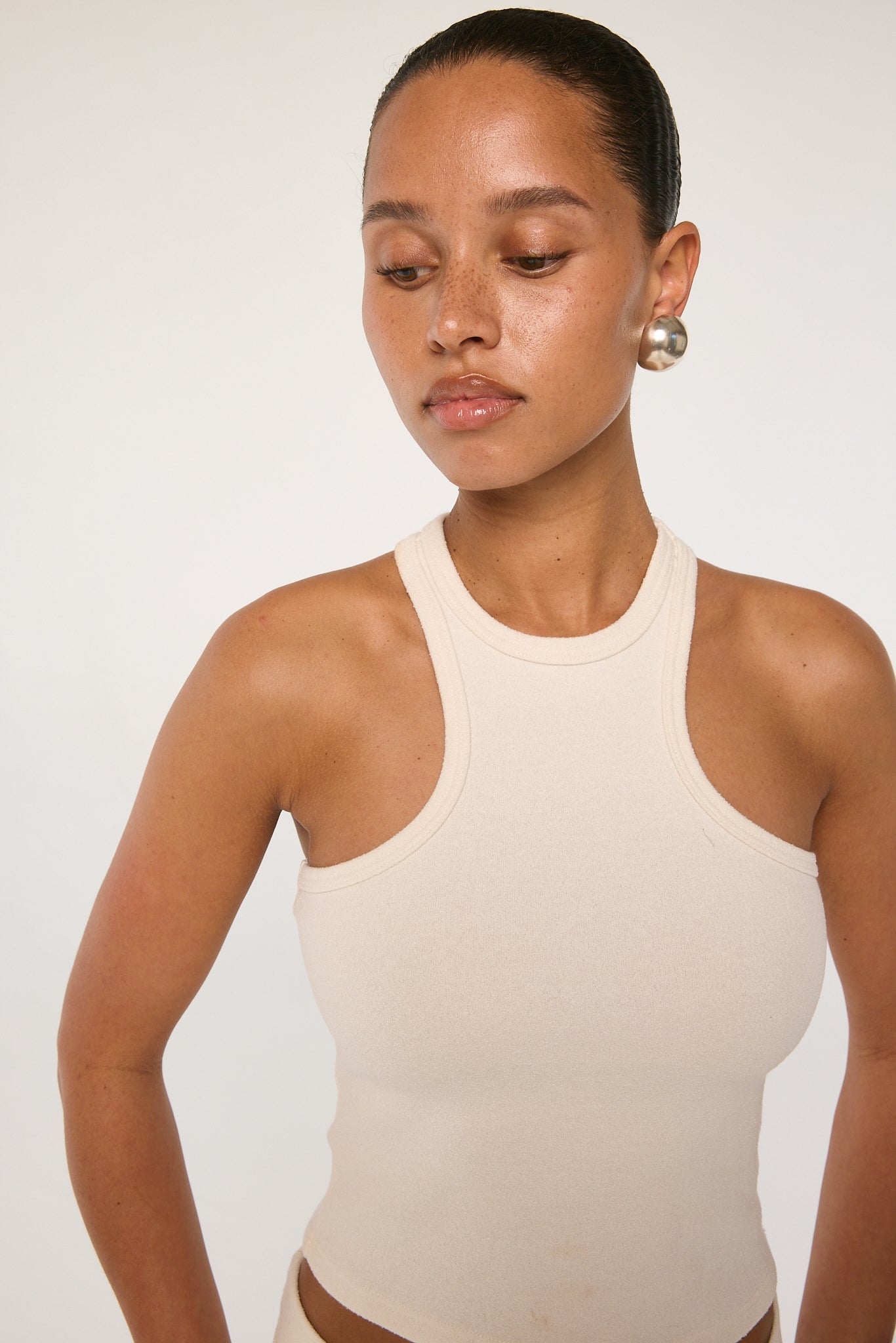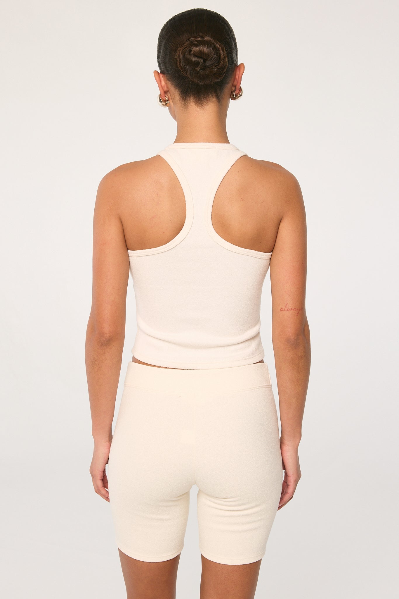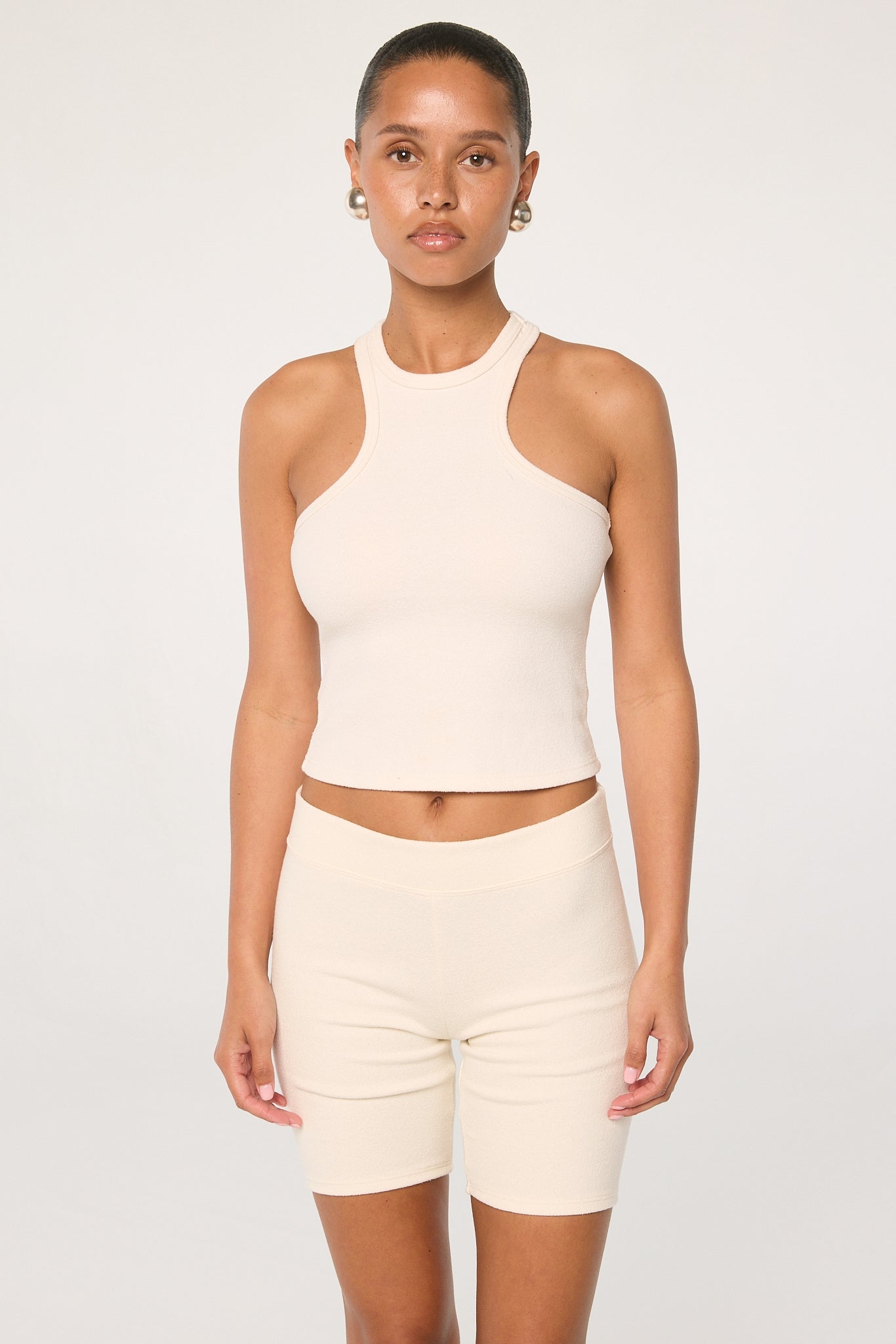 Cut from a Japanese thick terry textured fabric, the Tatum is a racerback tank and features a flattering neckline and a slightly cropped hem. Pairs well with the matching Kiko short or low-rise wide leg trousers.