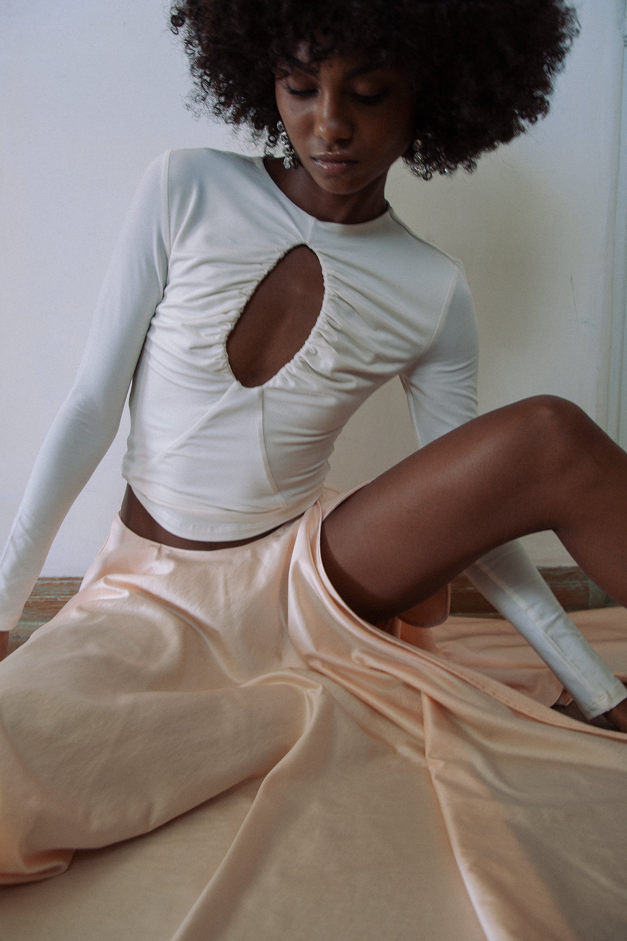The Demi top features a shirred keyhole at the center front and a flattering fit that hugs your body in all the right places. Cut from our buttery soft Tencel-jersey for maximum comfort and wearability. Pair with everything from a full skirt like the Ritsu or a wide-cut trouser like the Levin.