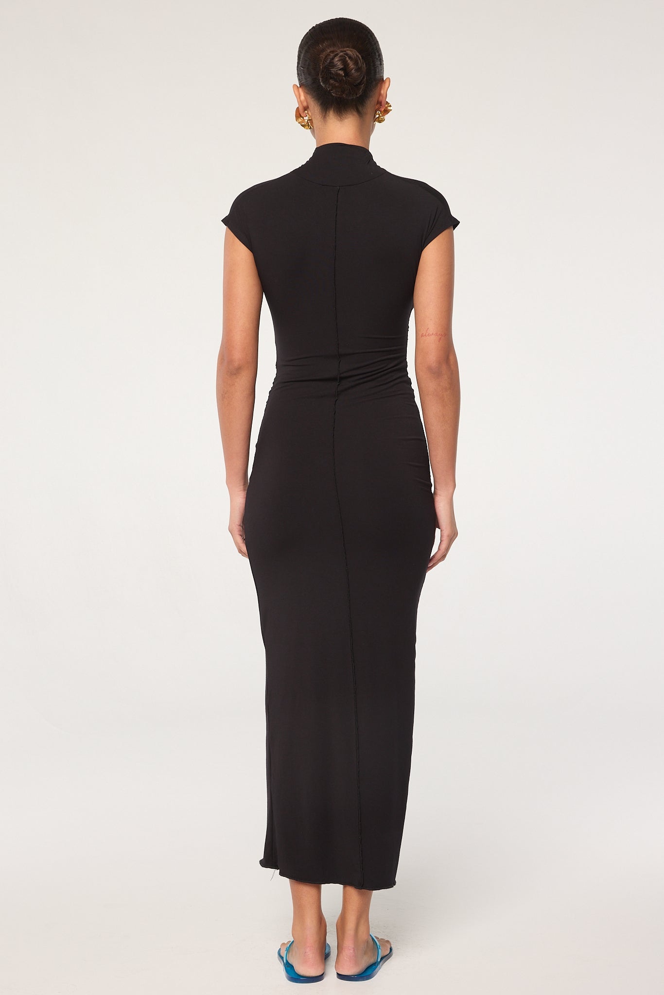 The Sinea Black Maxi Dress is cut from our signature micro modal jersey, offering a soft feel with comfortable stretch. Designed to be easy to wear, it features a fitted silhouette with a shirred bodice that overlaps at the side seam to create a flattering shape. The front and back are double-layered to help minimize sheerness, while merrow stitching at the hem and center back adds a refined finish. This maxi-length style pairs effortlessly with sandals or slides for a relaxed summer look.
