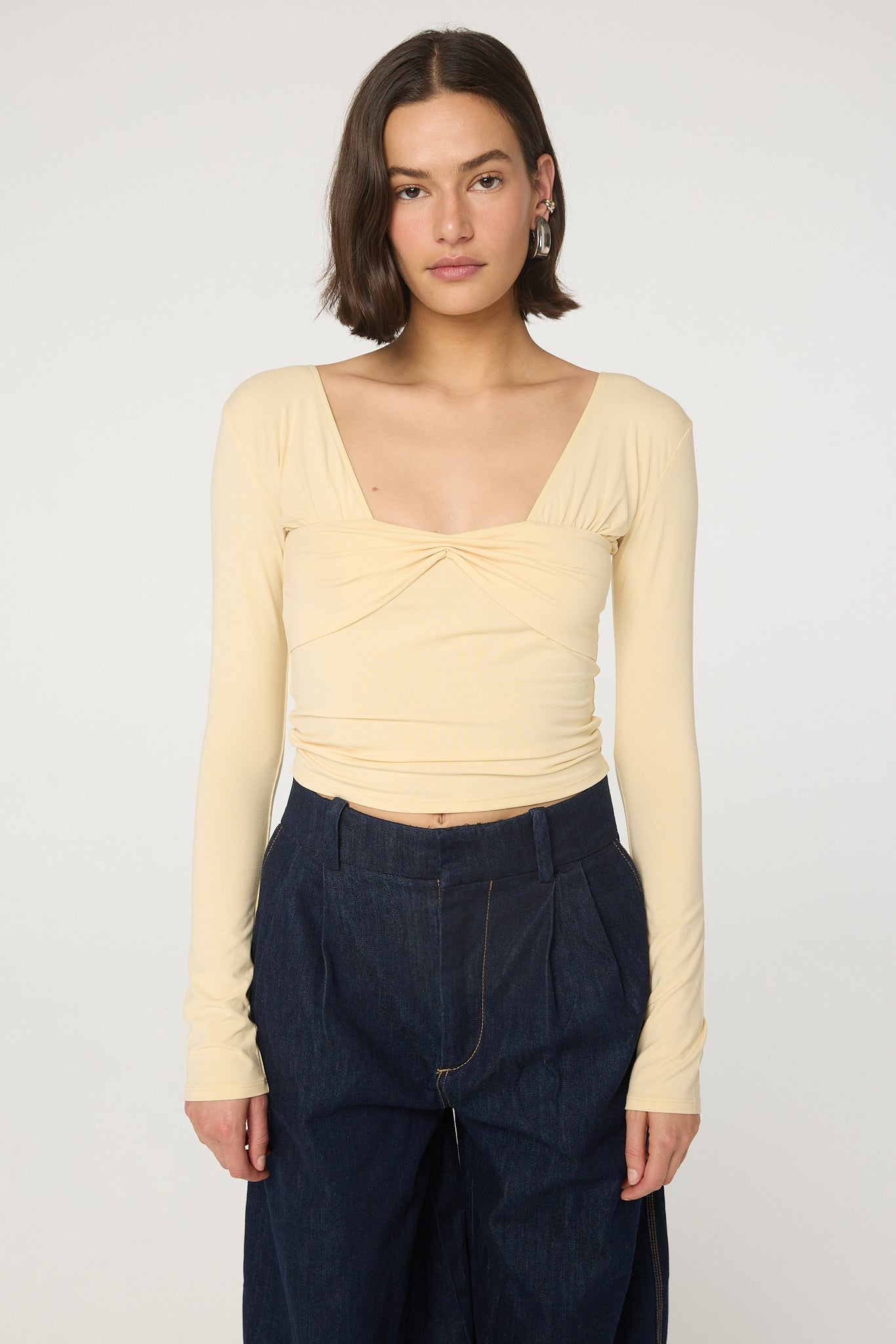 Cut from a mid-weight stretch Cotton-modal blend, the Rian features a straight neckline and delicate pleats at the center front. Pair with vintage denim or with a low cut slip skirt for an effortless look.