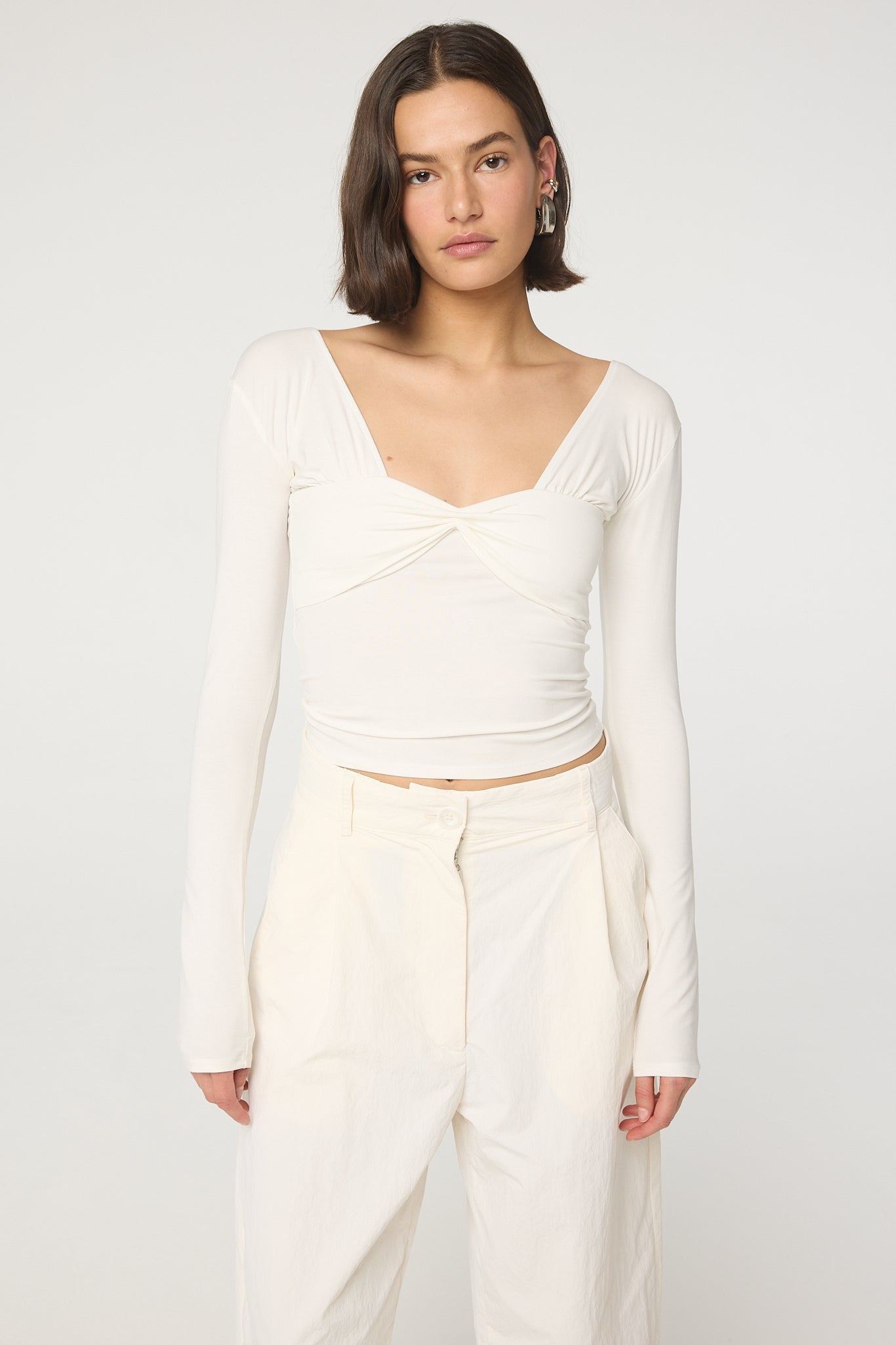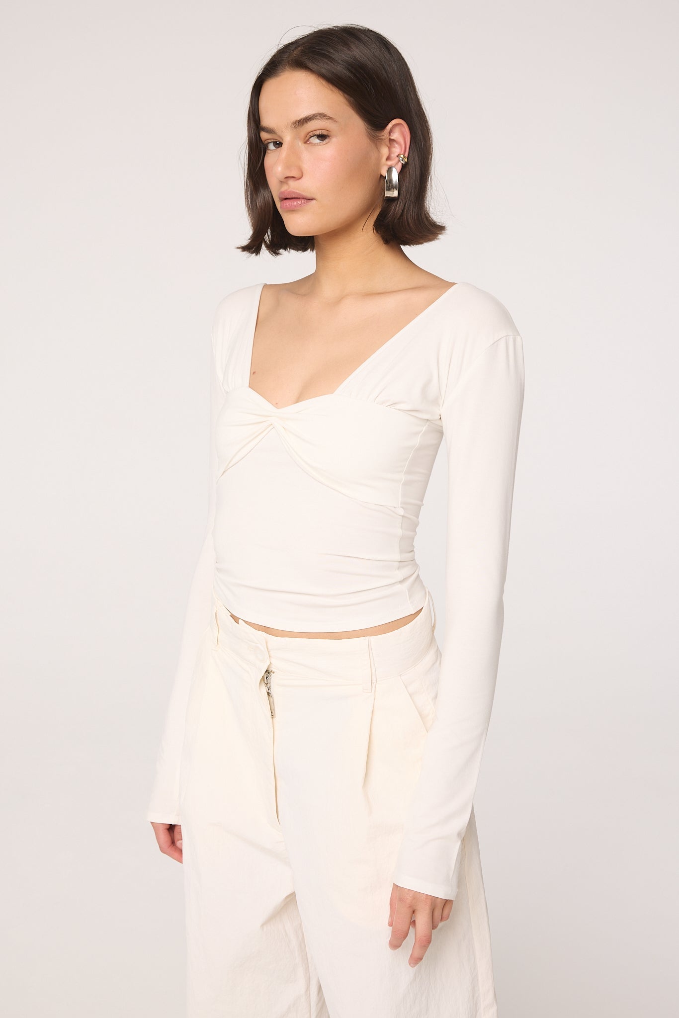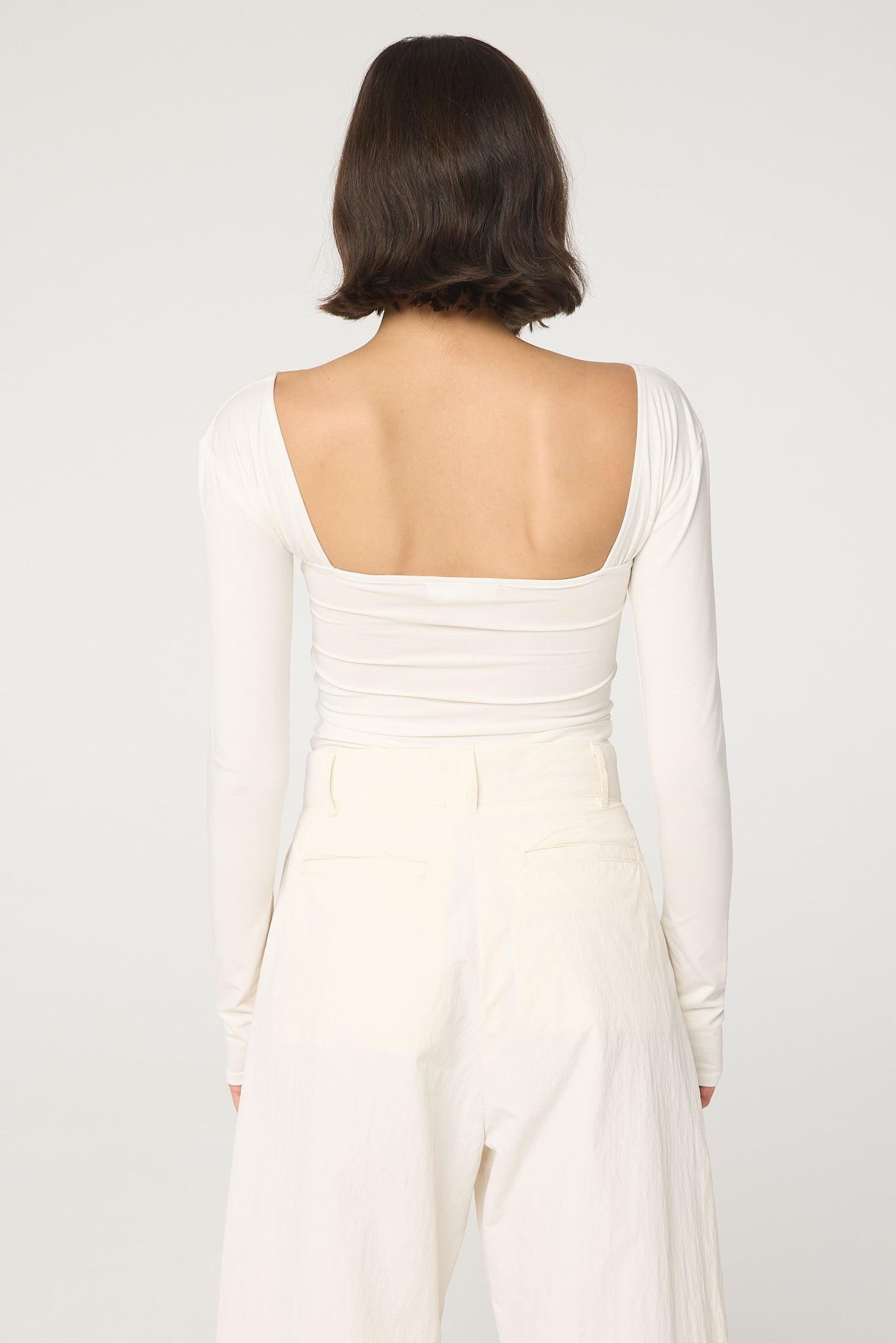 Cut from a mid-weight stretch Cotton-modal blend, the Rian features a straight neckline and delicate pleats at the center front. Pair with vintage denim or with a low cut slip skirt for an effortless look.