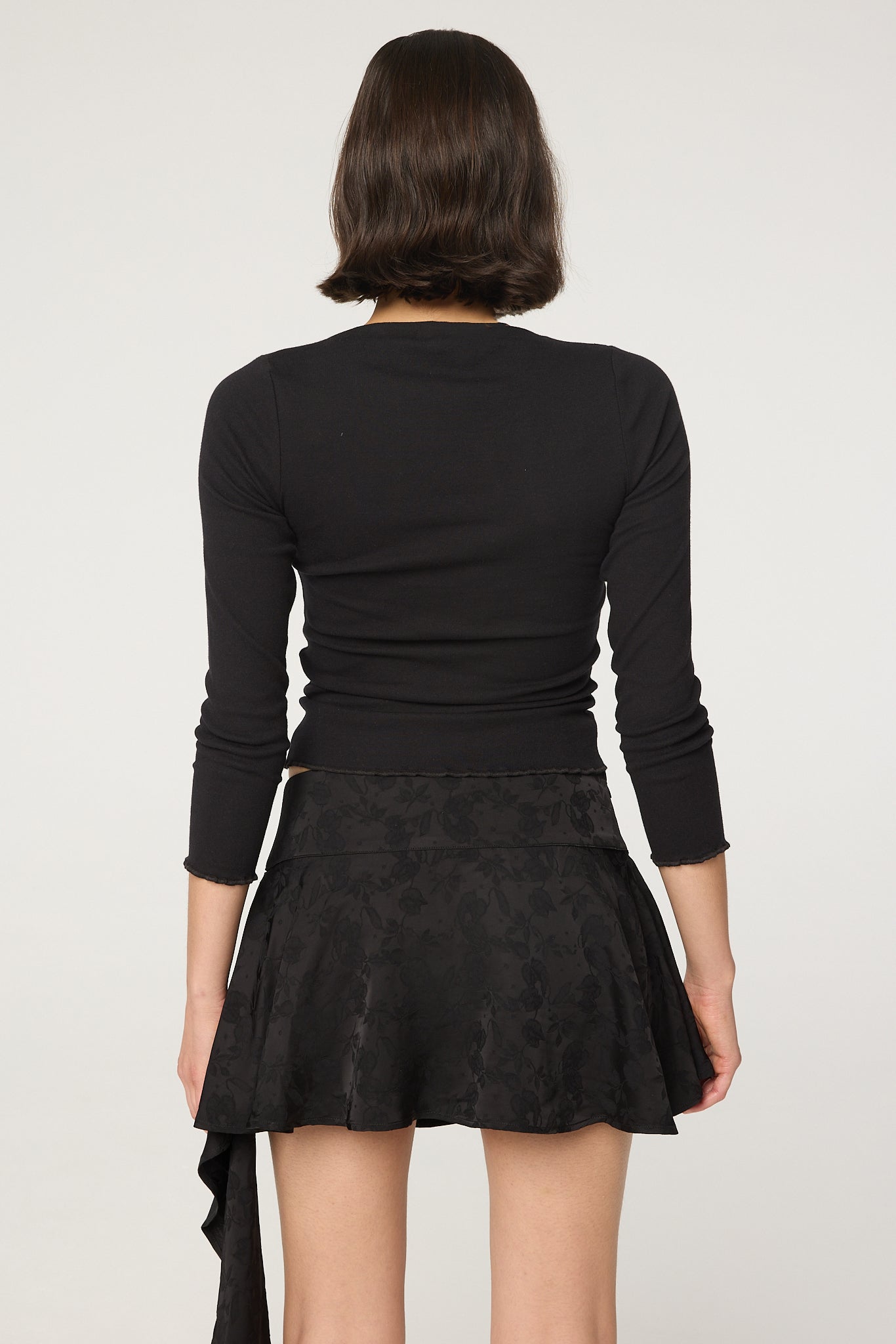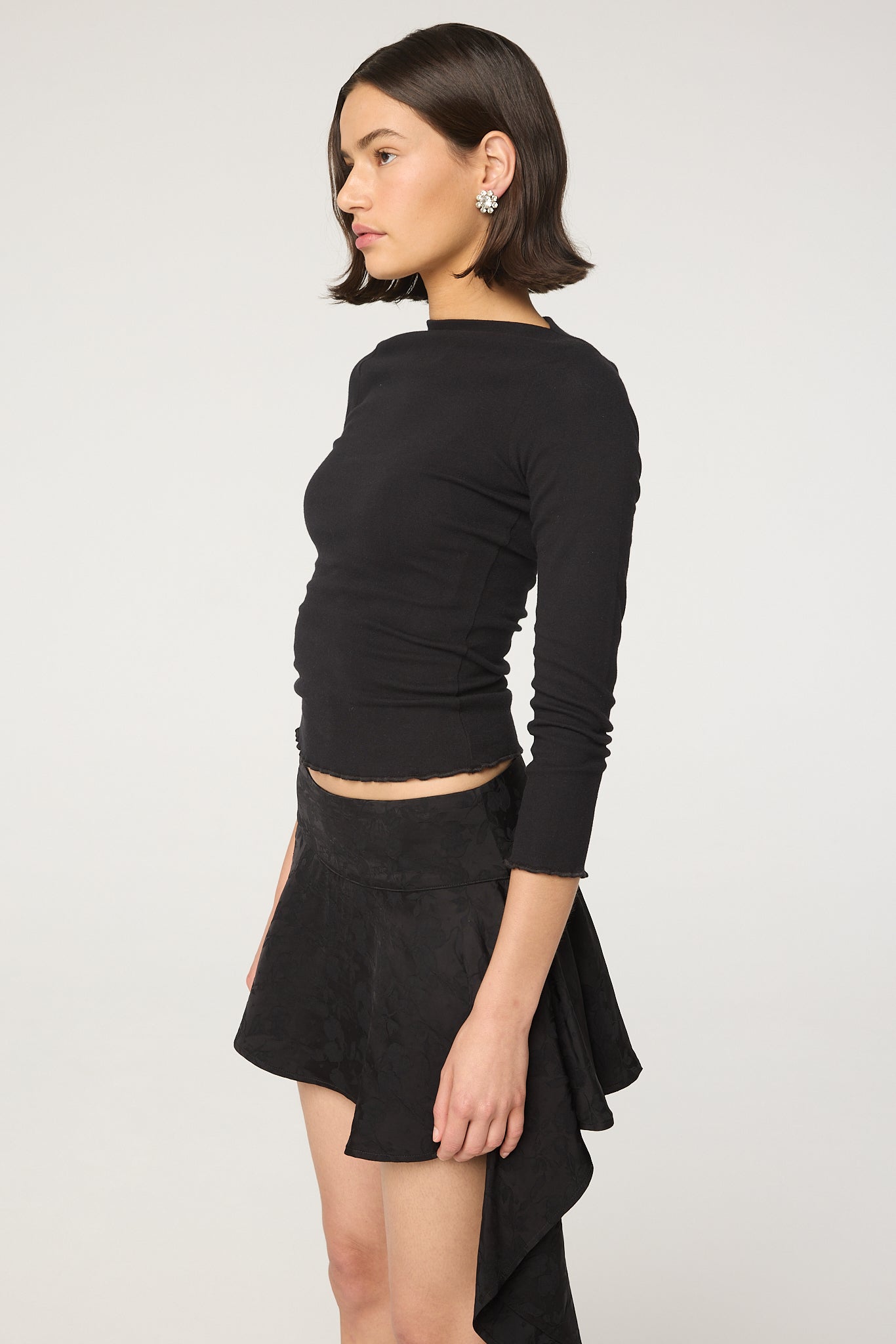 Cut from a mid-weight stretch-cotton 1x1 baby rib, the Elvie is the ideal foundation for easy dressing. Derived from a familar silhouette, the lettuce edge hem adds a small, yet impactful detail that upgrades this top from your regular longsleeve t-shirt. Pair with denim or with the Dom skirt for a balanced evening look.