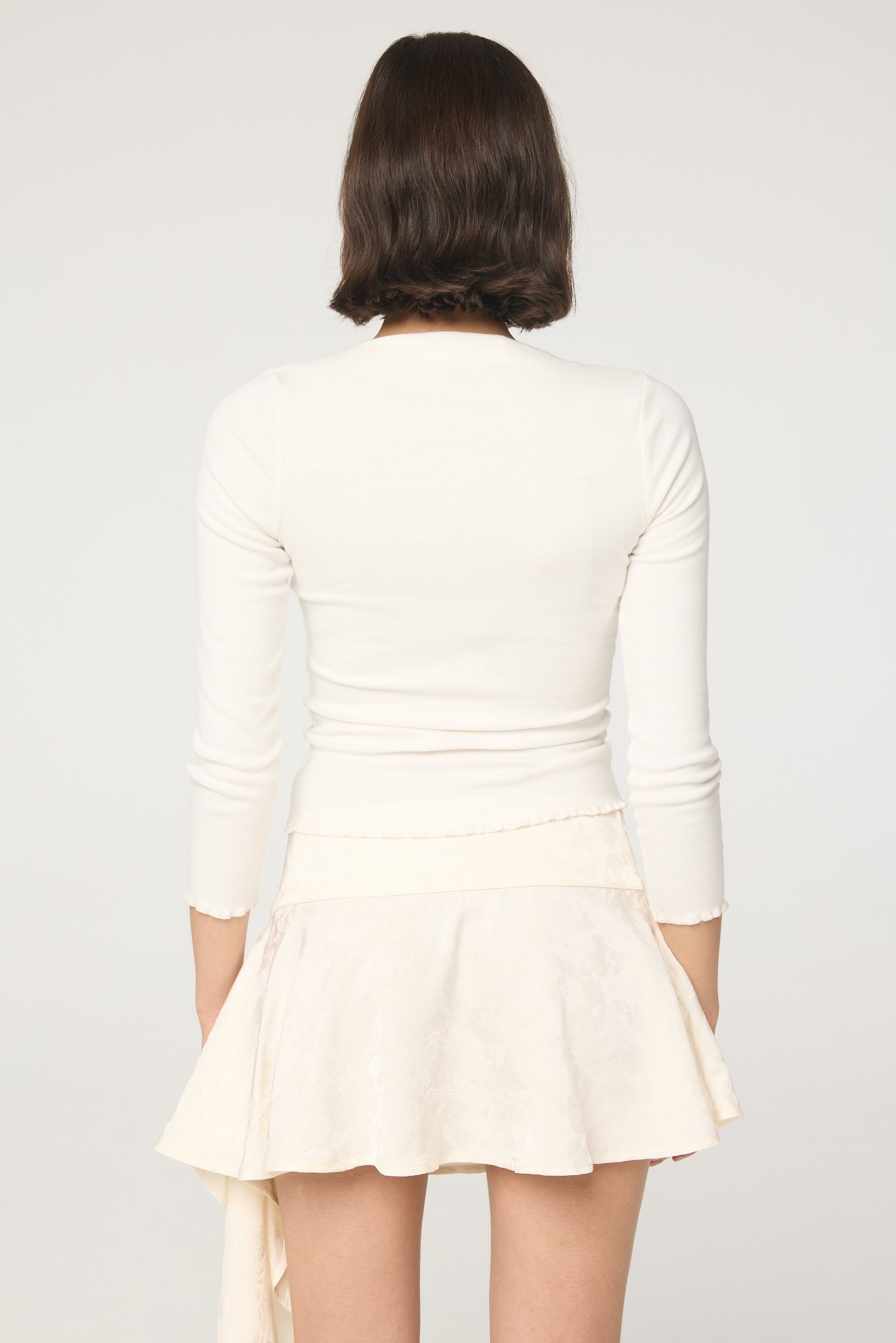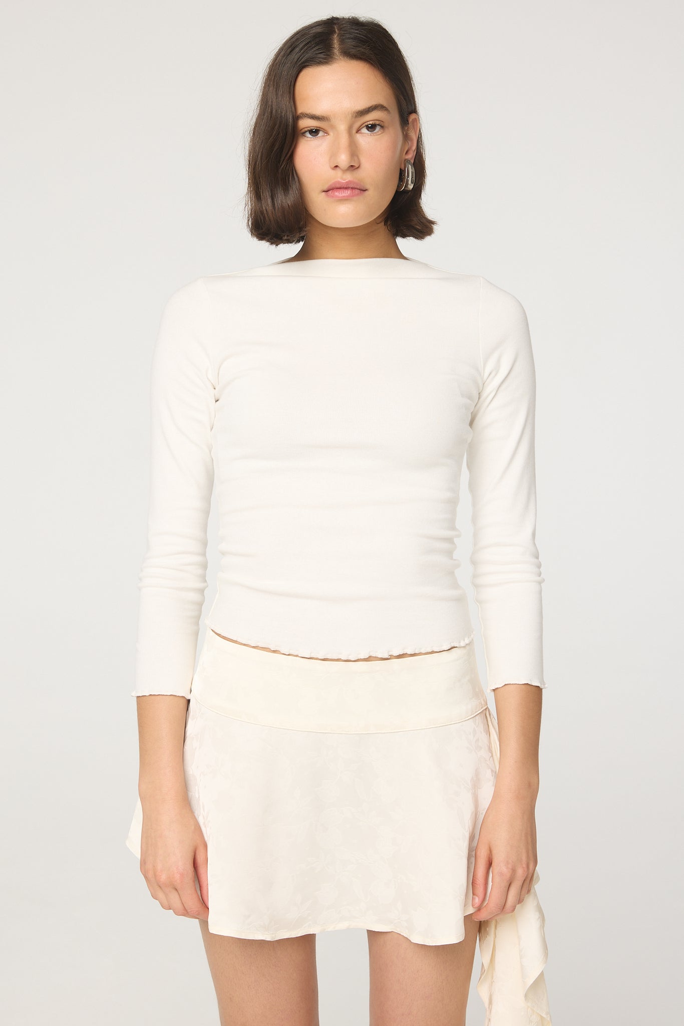 Cut from a mid-weight stretch-cotton 1x1 baby rib, the Elvie is the ideal foundation for easy dressing. Derived from a familar silhouette, the lettuce edge hem adds a small, yet impactful detail that upgrades this top from your regular longsleeve t-shirt. Pair with denim or with the Dom skirt for a balanced evening look.