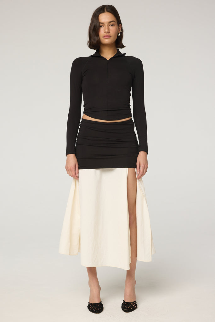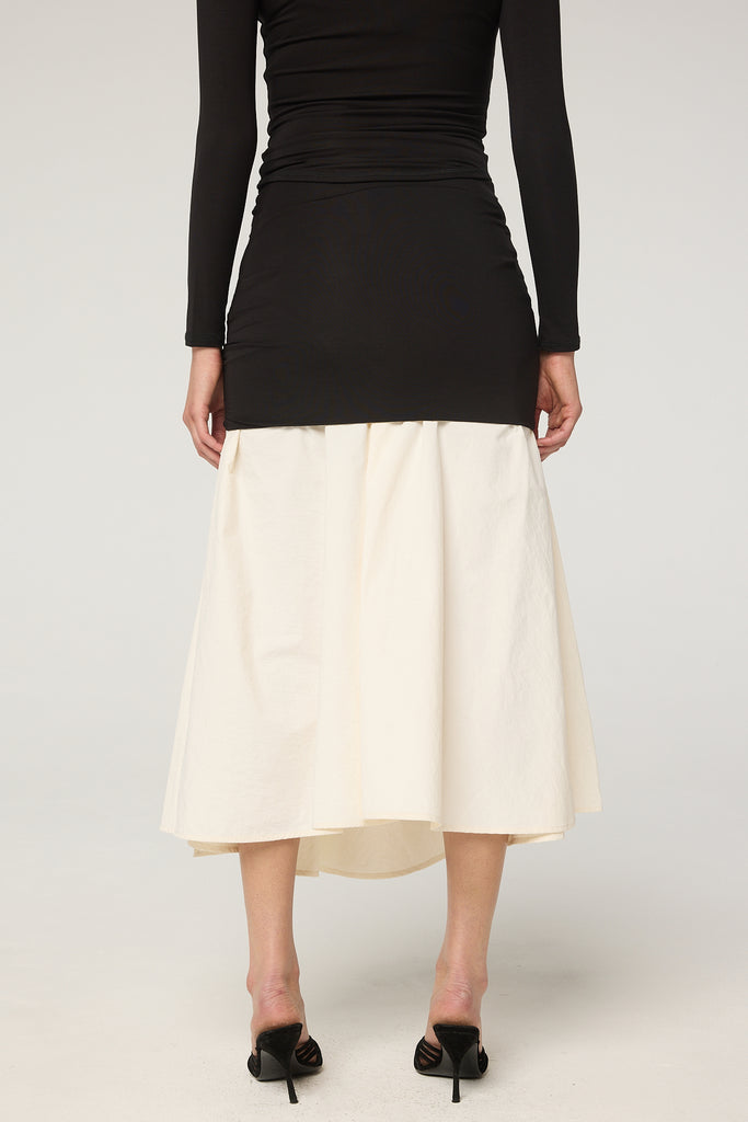 The Mari is a skirt crafted from two contrasting fabrics: our buttery soft Tencel-jersey and a crisp nylon. Featuring a 2-ply tube skirt layered over a slitted A-line skirt, the Mari is a favorite TLBK silhouette. Pair yours with the Selvie top for an effortless look.